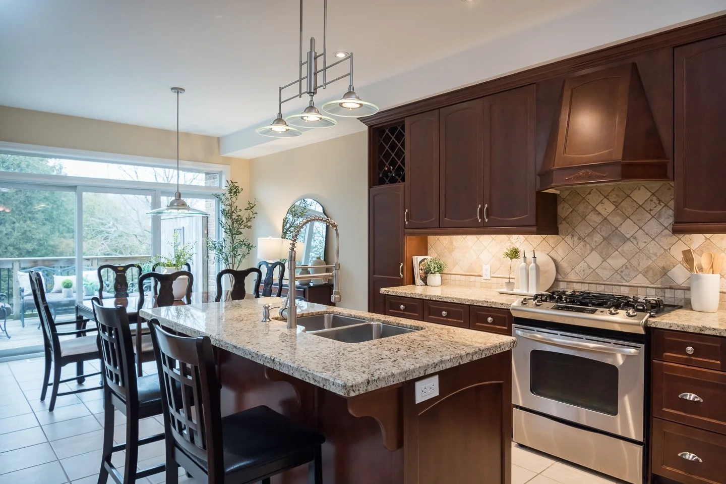 The kitchen is a chef's dream with granite countertops, a travertine backsplash, under-valance lighting, glass corner cabinet, a lazy susan, pot drawers, and a striking built-in hood fan. Stainless steel appliances, including a gas stove and an inviting breakfast bar, make this space the heart of the home. Adjacent to the kitchen, the spacious dining area opens onto an elevated deck with a retractable awning, providing the perfect spot for your morning tea or an evening nightcap amidst nature.