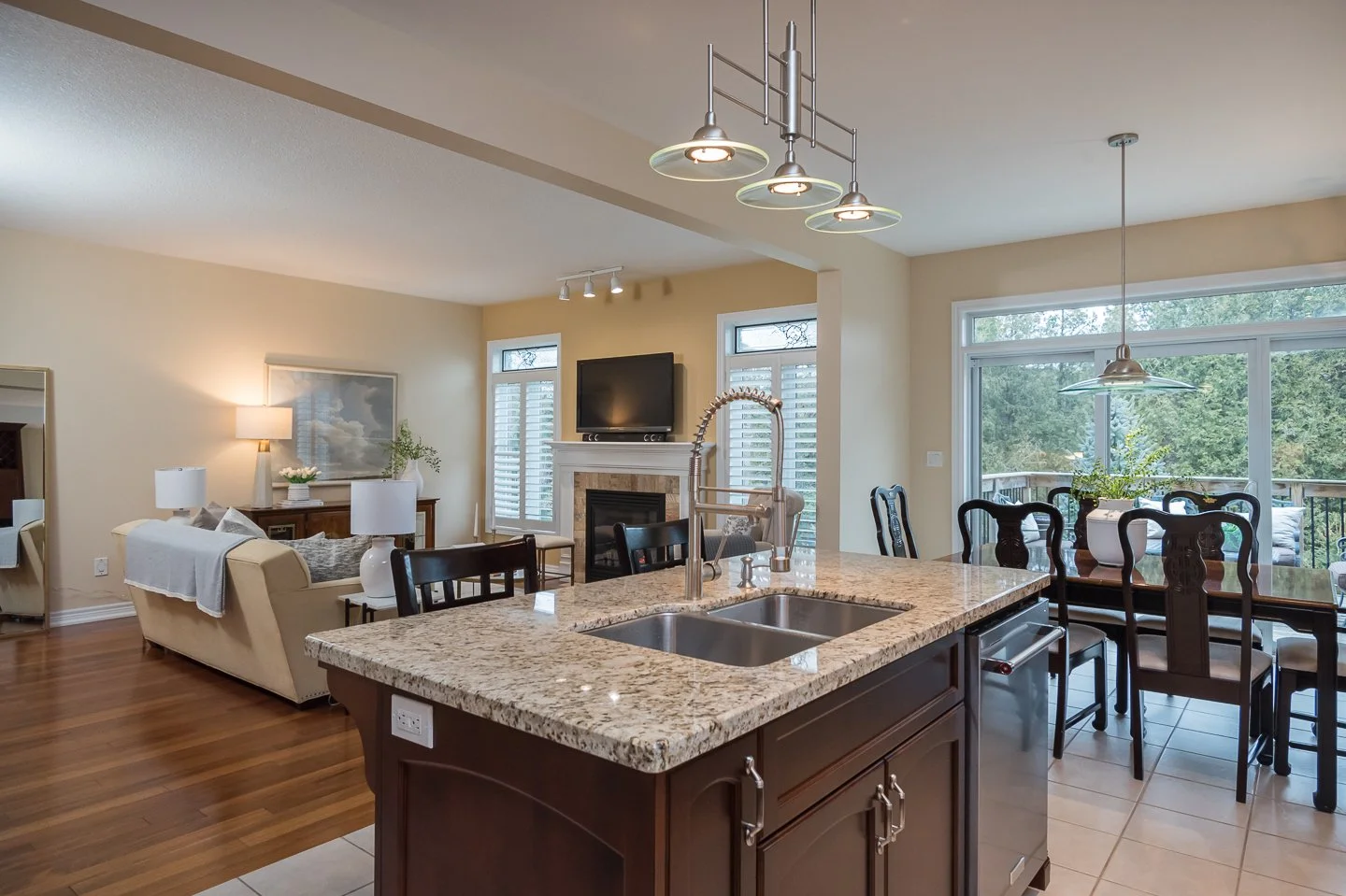 The basement offers even more living space, with another full bathroom and a spacious recreation room complete with a cozy gas fireplace. The open concept layout flows effortlessly out to to the covered deck and the green space beyond.